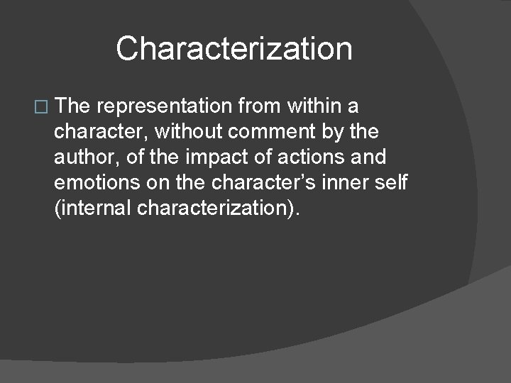 Characterization � The representation from within a character, without comment by the author, of the impact of actions and emotions on the character’s inner self (internal characterization).
