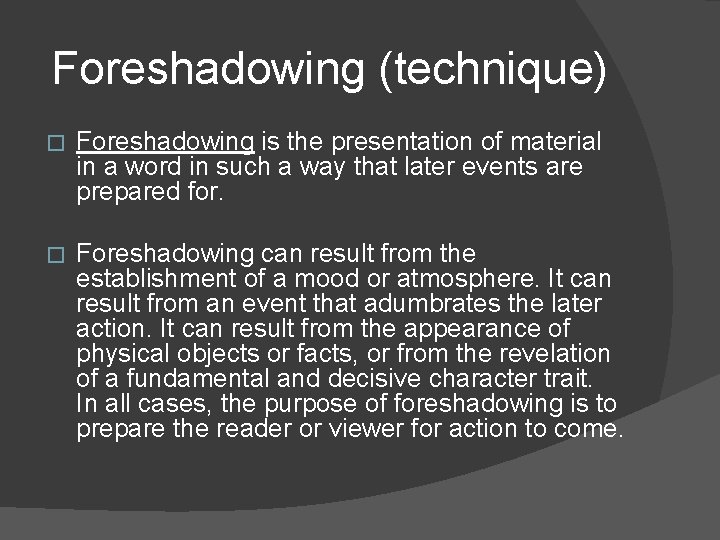 Foreshadowing (technique) � Foreshadowing is the presentation of material in a work in such a way that later events are prepared for. The purpose of foreshadowing is to prepare the reader or viewer for action to come. � Foreshadowing can result from �the establishment of a mood or atmosphere, �an event that adumbrates the later action, �the appearance of physical objects or facts, or �the revelation of a fundamental and decisive character trait.
