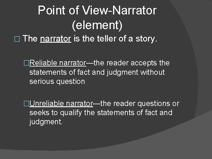 Point of View-Narrator (element) � The narrator is the teller of a story. �Reliable narrator—the reader accepts the statements of fact and judgment without serious question �Unreliable narrator—the reader questions or seeks to qualify the statements of fact and judgment.
