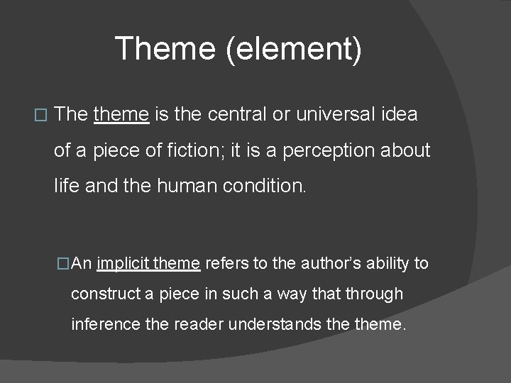 Theme (element) � The theme is the central or universal idea of a piece of fiction; it is a perception about life and the human condition. �An implicit theme refers to the author’s ability to construct a piece in such a way that through inference the reader understands theme.