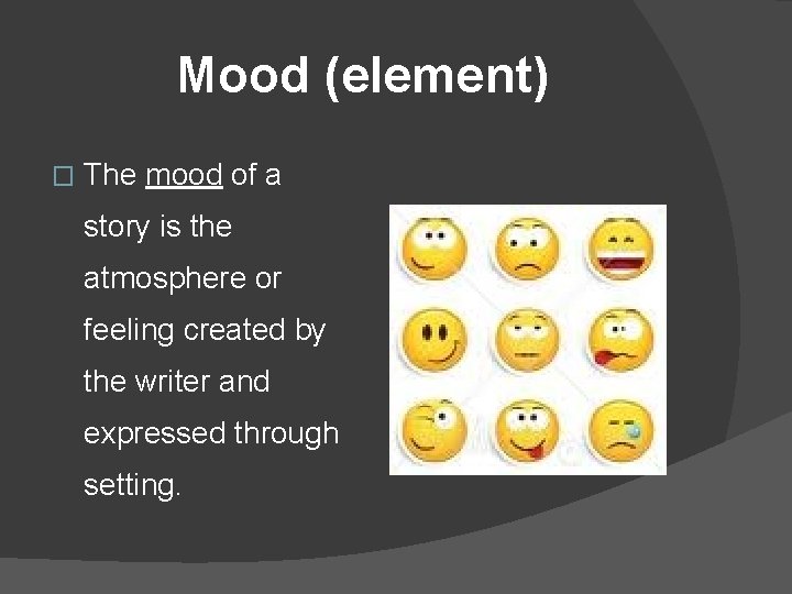 Mood (element) � The mood of a story is the atmosphere or feeling created by the writer and expressed through setting.