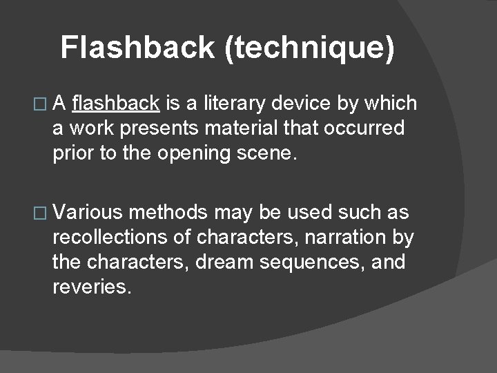 Flashback (technique) �A flashback is a literary device by which a work presents material that occurred prior to the opening scene. � Various methods may be used such as recollections of characters, narration by the characters, dream sequences, and reveries.