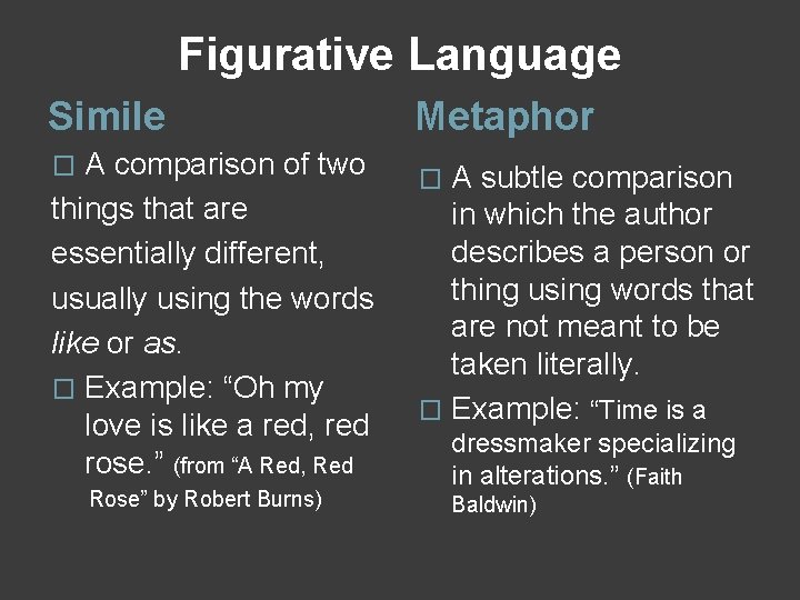 Figurative Language Simile A comparison of two things that are essentially different, usually using the words like or as. � Example: “Oh my love is like a red, red rose. ” (from “A Red, Red � Rose” by Robert Burns) Metaphor A subtle comparison in which the author describes a person or thing using words that are not meant to be taken literally. � Example: “Time is a � dressmaker specializing in alterations. ” (Faith Baldwin)
