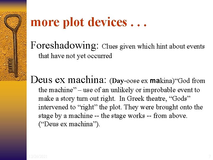 more plot devices. . . Foreshadowing: Clues given which hint about events that have not yet occurred Deus ex machina: (Day-oose ex makina)“God from the machine” – use of an unlikely or improbable event to make a story turn out right. In Greek theatre, “Gods” intervened to “right” the plot. They were brought onto the stage by a machine -- the stage works -- from above. (“Deus ex machina”). 12/26/2021 7