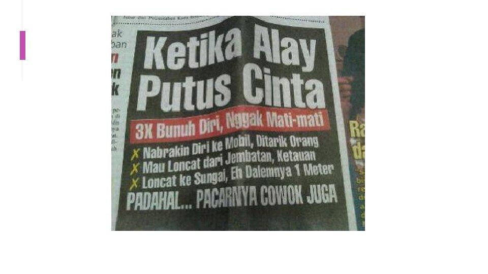 BERKAH MEDIA BARU • KECEPATAN – internet menjanjikan kecepatan realtime, supercepat. Transaksi bisa berjalan lancar dan cepat. • JANGKAUAN – world wide web, menjangkau seluruh penjuru dunia, bisa membuat bukan apaapa menjadi sesuatu yang sangat terkenal (populer). • KEKAYAAN ISI – konten media hampir tak terbatas, serba ada, serba terkait satu sama lain (hyperlink). • MULTIGUNA - komunikasi apapun bisa menggunakan media baru; pendidikan, keluarga, bisnis, kegiatan keagamaan, dll. • KEMUDAHAN - relatif tidak memerlukan keahlian khusus untuk mengakses dan memproduksi pesan di media baru.