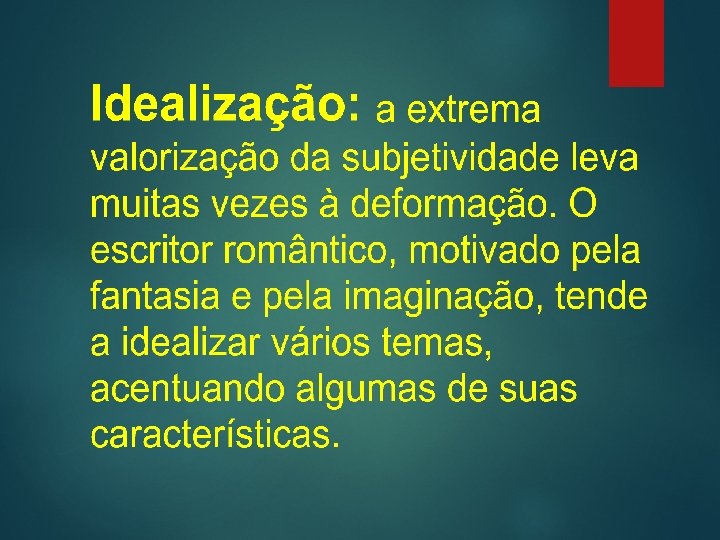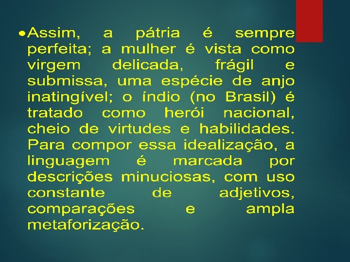 Características da prosa romântica Idealização do herói: ser dotado de honra, de idealismos e coragem = põe a própria vida em risco para atender aos apelos do coração ou da justiça = em algumas obras assume as feições de “cavaleiro medieval”. Idealização da mulher: são desprovidas de opinião própria, são frágeis, dominadas pela emoção, obedientes às determinações dos pais e educadas para o casamento.