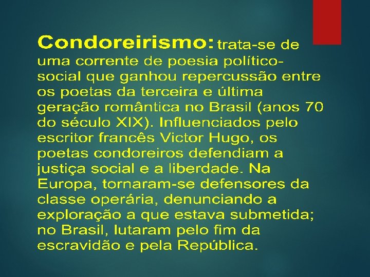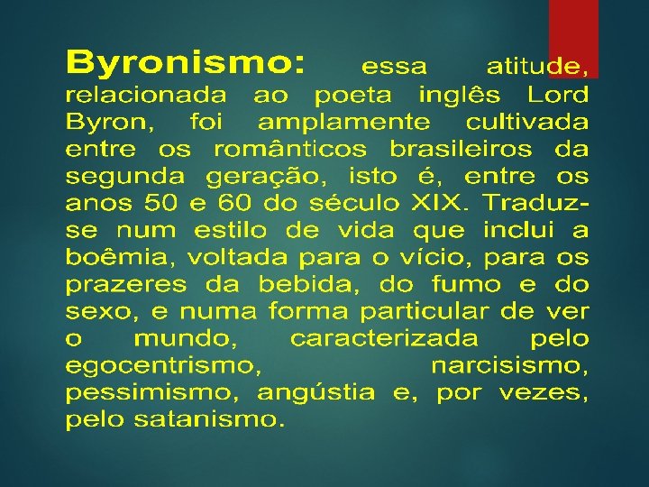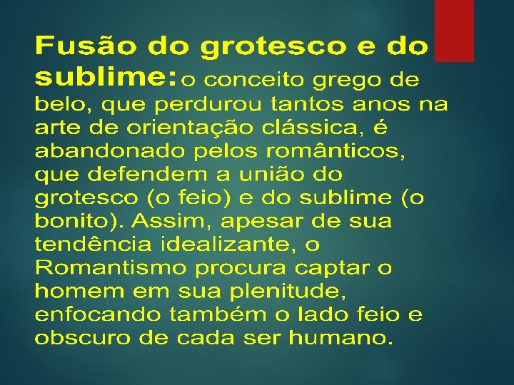 Características da prosa romântica Flash-back narrativo: volta no tempo para explicar, por meio do passado, certas atitudes das personagens no presente. O amor como redenção: oposição entre os valores da sociedade e o desejo de realização amorosa dos amantes = o amor é visto como único meio de o herói ou o vilão romântico se redimirem e se “purificarem” = solução: em muitas casos: a morte.