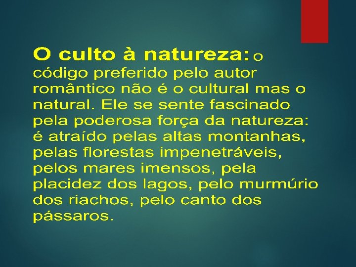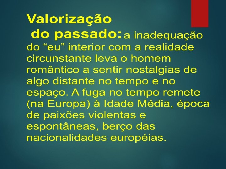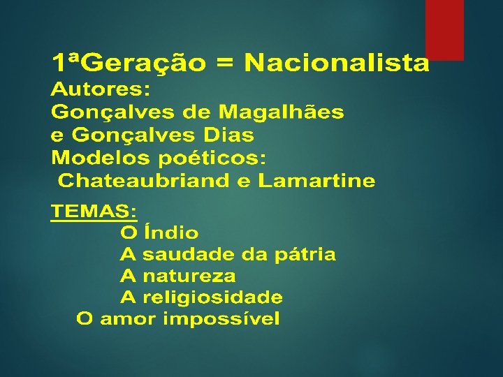 Nacionalismo romântico Valores formais procedentes do universo europeu X Temática nacional (a cor local): INDIANISMO; SERTANISMO (OU REGIONALISMO); CULTO À NATUREZA; NACIONALISMO UFANISTA; BUSCA DE UMA LINGUAGEM LITERÁRIA BRASILEIRA.