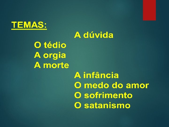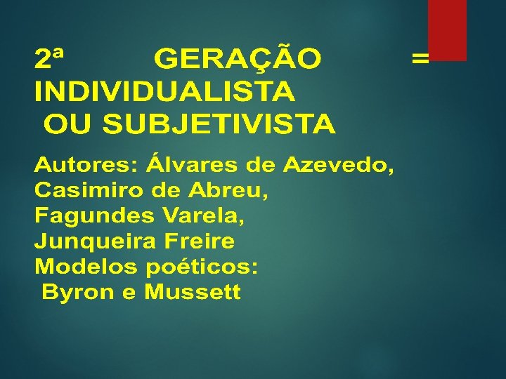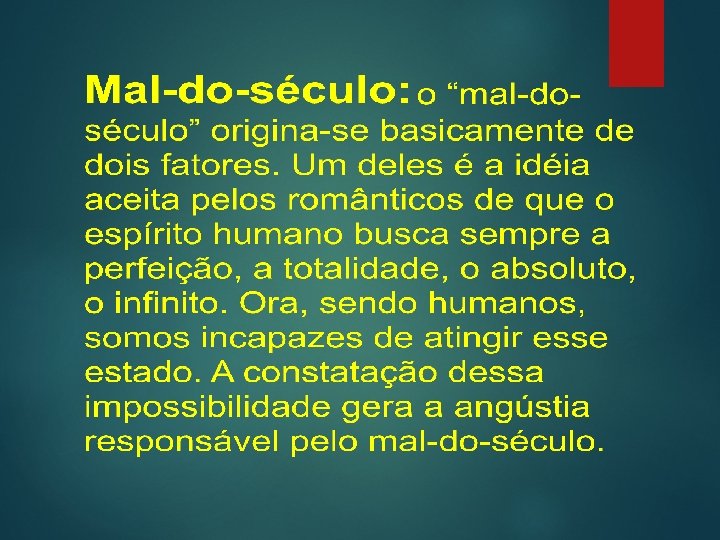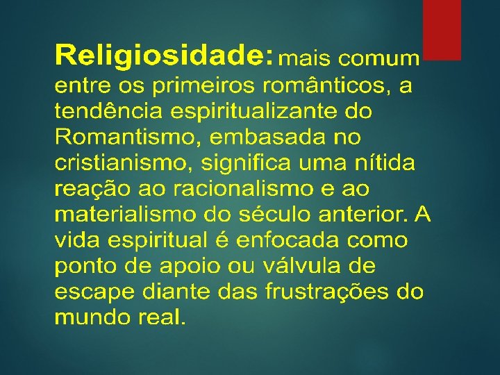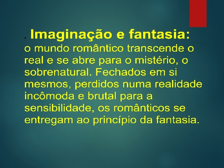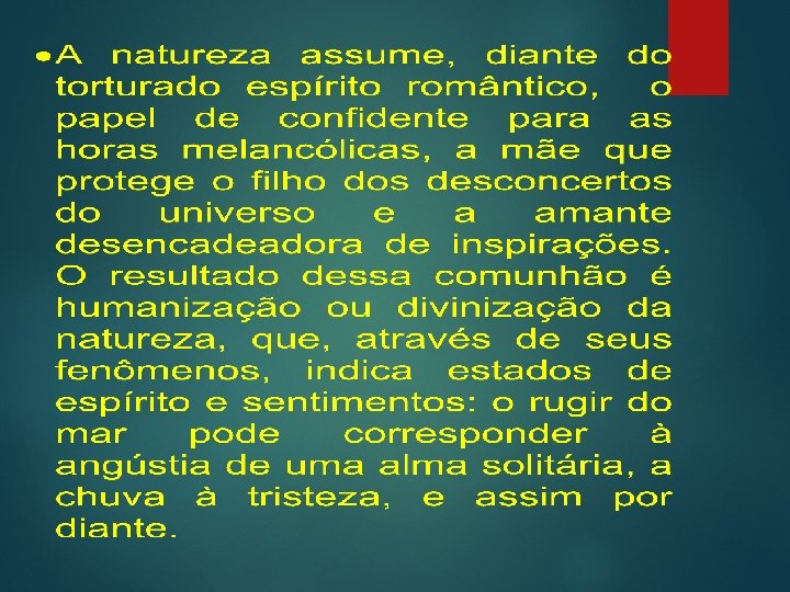 Sentimentalismo: entre o artista romântico e o mundo é sempre mediada pela emoção. Qualquer que seja o tema abordado - amoroso, político, social -, o tratamento literário revela grande envolvimento emocional do artista. Assim, os sentimentos tornam-se mais importantes do que a racionalidade e são, conseqüentemente, a medida da interioridade de cada pessoa, medida de todas as coisas. a relação