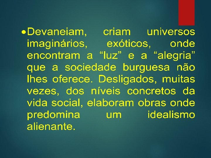 · Individualismo e subjetivismo: o artista romântico trata dos assuntos de uma forma pessoal, de acordo com o modo como vê e sente o mundo; dizemos que sua arte é subjetiva porque expressa uma visão particular da realidade. A ideologia burguesa centrou-se nas liberdades do homem e nas infinitas possibilidades de autorealização do indivíduo.