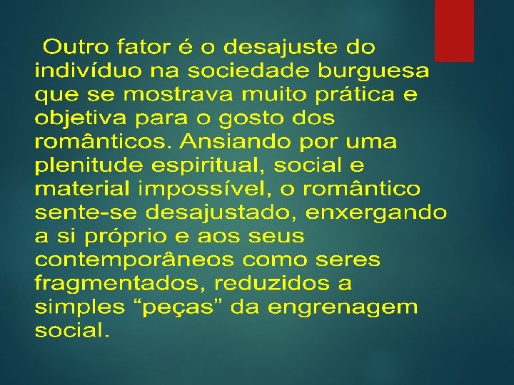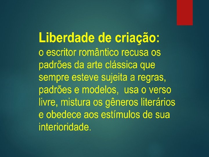 ROMANTISMO = NOVOS VALORES Novo sentido de vida: Livre iniciativa + competição e individualismo; Apogeu do Liberalismo burguês; Extinção “Fim dos privilégios seculares da nobreza; das barreiras” rígidas entre as classes sociais.
