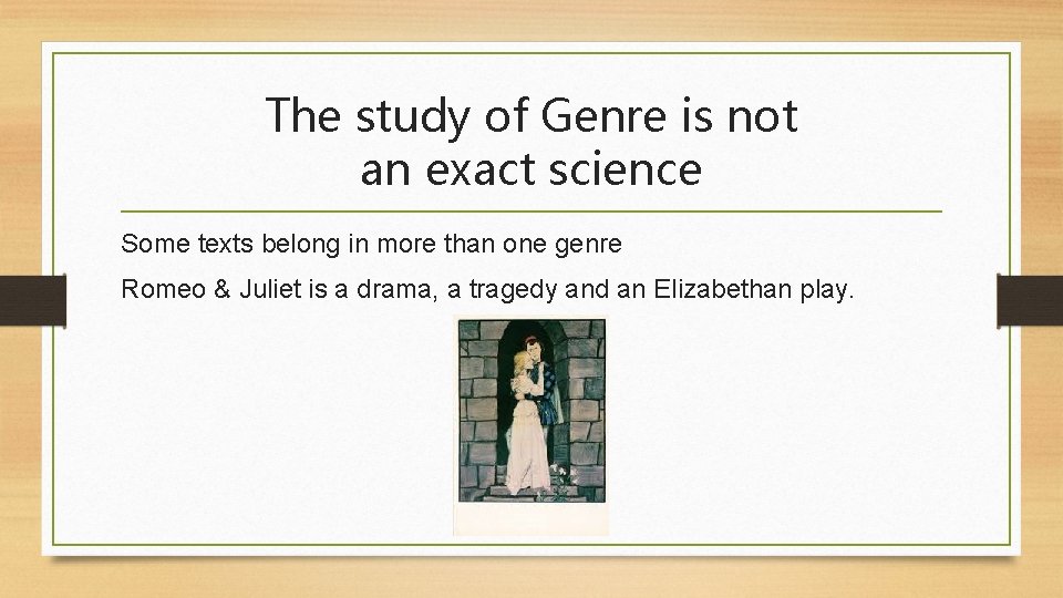 The study of Genre is not an exact science Some texts belong in more than one genre Romeo & Juliet is a drama, a tragedy and an Elizabethan play.