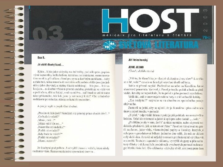 2004 Ze soutěžních prací… Eva B. Ale ten kůň tu pořád je … …Některý rána chutnaj jako kafe druhák a zítřek, kdy bude líp, je nepředstavitelně daleko. Zamčená ve skříni podmíněnejch reflexů přežíváš. I úsměv už ses naučila zpaměti, protože: „Co je komu do toho, že je mi mizerně. “ Show must go on. Kafe nalívat na třikrát, v pondělí sýrovou omáčku a nemyslet na chameleona… …vlastně na černýho okřídlenýho koně… (. . psychoterapie, geriavit, meduňka, suché koupele, masáže, solárium, …) Ale ten kůň tu pořád je. Ptáš se „Proč zrovna já? “, ale nikdy ti neodpoví. A proč máš hnědý vlasy, zeptá se. Odpovíš: „Odbarvím si je, “ a on se ušklíbne: „To seš celá ty, zase se díváš jinou dírkou…“ … … … …