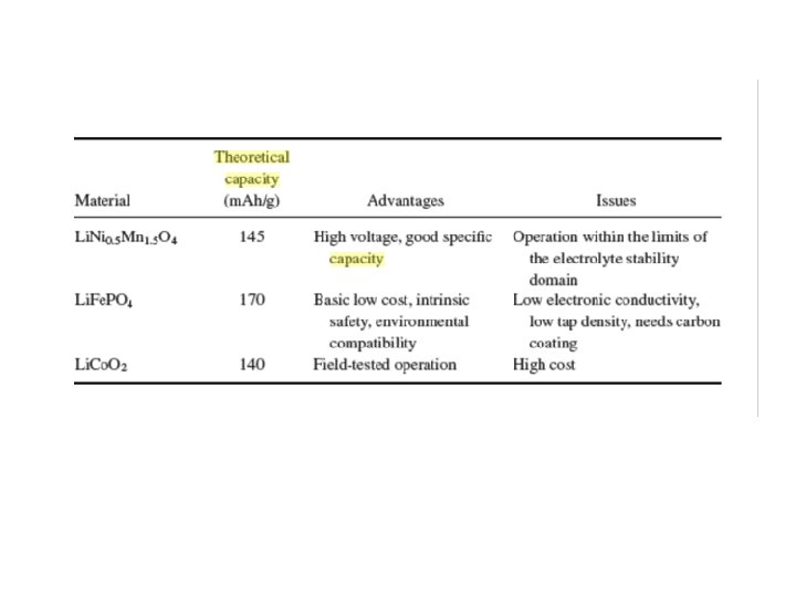 Cathode material Discharge Theoretical Voltage V vs. Li 0 capacity (m. Ahg-1) True density (g Diffusivity cm-3) (cm 2 s-1) Li. Mn. PO 4 4. 1 171 3. 43 10 -7 Li. Fe. PO 4 3. 4 170 3. 60 10 -8 Li. Co. PO 4 4. 8 167 3. 70 10 -9 Li. Ni. PO 4 5. 1 167 3. 89 10 -5 Li 1. 07 Mn 1. 93 O 4 3. 9 117 4. 15 ~10 -10 Li. Al 0. 05 Co 0. 15 Ni 0. 8 O 2 3. 6 265 4. 73 ~10 -8 Li. Co. O 2 3. 6 274 5. 05 ~10 -8 Source Theoretical evaluation of high-energy lithium metal phosphate cathode materials in Li-ion batteries –JPS -165(2007)887 -891