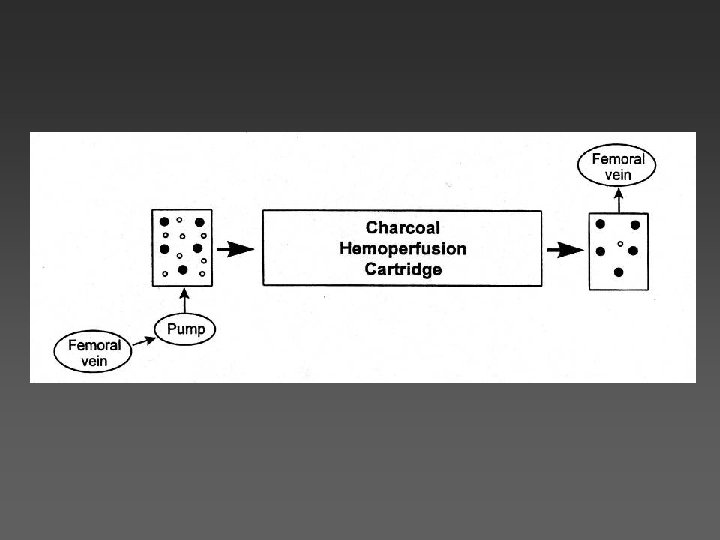 Charcoal hemoperfusion • Uses same vascular access and dialysis pumps • Greater anticoagulation required • Saturation of charcoal limits duration • But, it is not dependent on drug size, water solubility or protein binding as long as drug binds to charcoal • Can be used in series with dialysis
