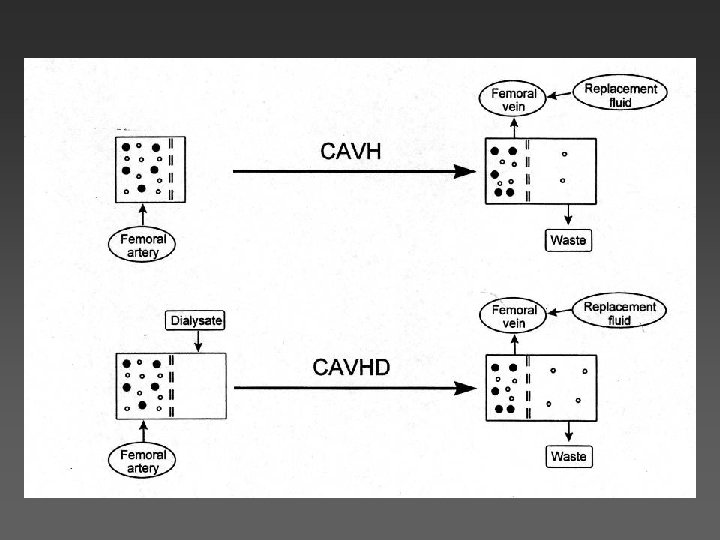 Continuous hemofiltration • Plasma moves across semipermeable membrane under hydrostatic pressure • No dialysate • Solutes follow the plasma water size up to MW ~ 10, 000 -40, 000 • CL lower than HD or HP, but it can be performed 24 hrs/day