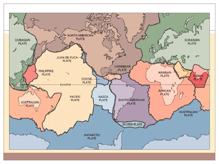 Plate Tectonics �Earth’s crust is divided into 12 major plates which move in various directions �This plate motion causes them to collide, pull apart, or scrape against each other. �They move a few centimeters each year. �Each type of interaction causes a characteristic set of Earth structures, or “tectonic” features. Plate tectonics = Plate Interactions