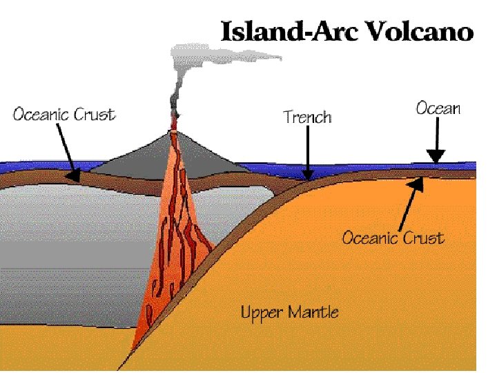 Oceanic-Oceanic plate convergence When two oceanic plates converge one is usually subducted under the other and in the process a deep oceanic trench is formed. Oceanic-oceanic plate convergence also results in the formation of undersea volcanoes. Over millions of years, however, the erupted lava and volcanic debris pile up on the ocean floor until a submarine volcano rises above sea level to form an island volcano. Such volcanoes are typically strung out in chains called island arcs.