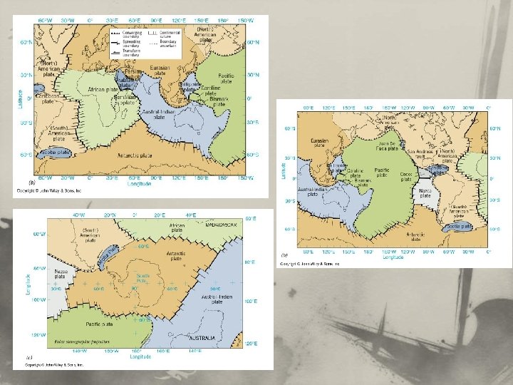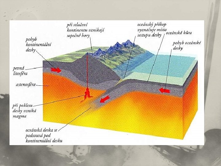 Pohyb a interakce litosférických desek Typy deskových rozhraní: n divergentní rozhraní (tvorba oceánské kůry a oddalování desek – spreading), n konvergentní rozhraní (zánik oceánské kůry a přibližování desek – subdukce), n transformní rozhraní (horizontální posun desek).