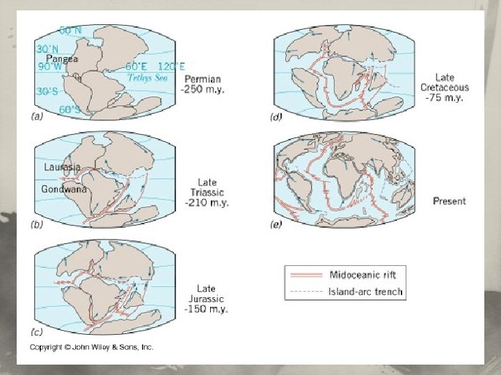 Historie kontinentů + Wilsonův cyklus n Průměrná rychlost pohybu litosférických desek: …………cm/rok n Rozpad superkontinentu …………, který byl obklopen oceánem ………… (perm, 250 mil. let BP) n Pangea → jižní polokoule – ………… (Jižní Amerika, Afrika, Antarktida, Austrálie, Nový Zéland a Madagaskar, Indie); severní polokoule – ………… (Severní Amerika, Eurasie). n Gondwana a Laurasie byly odděleny oceánem …………. n Posuny kontinentů ovlivnily přírodní podmínky (…………………. ).