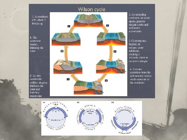 n Za Wilsonův cyklus se považuje neustále otevírání nových a zavírání existujících oceánských oblastí způsobené pohybem litosferických desek. n Cyklus počíná vznikem riftové oblasti (tam kde je ztenčená zemská kůra a nebo kde je vystouplá svrchní část zemského pláště a dochází k výstupům magmatu) - dochází k otevírání oceánu. n V oblasti riftu vzniká nová zemská kůra a ta okolní je postupně od riftové oblasti odtlačována do stran - dochází k rozpínání oceánské oblasti. n Poté co oceán nabyde určité šířky a začne docházet k jeho stlačování a oceánská kůra se začne podsouvat pod kontinentální (subdukce) a rozsah oceánu se zmenšuje - dochází k zavírání oceánu. n Nakonec vše končí v subdukčních zónách - v kolizních oblastech, kde na sebe naráží dvě litosferické desky a jedna se podsouvá pod druhou, což je doprovázeno vznikem pásemných pohoří - dochází k úplnému uzavření oceánu a vyvrásnění pohoří, které je následně erodováno a dochází k zarovnávání povrchu účinky vnějších geologických činitelů.