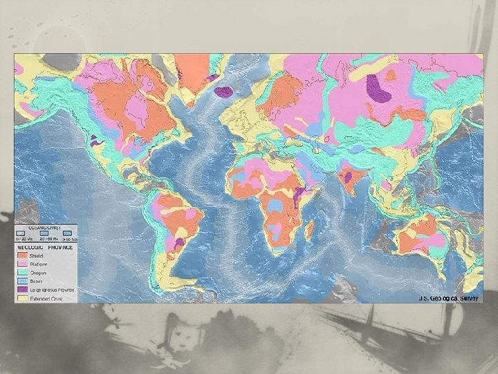 n Makrotvary zemského povrchu: ……………. . = kontinenty, ………… = oceánské pánve. n …. % zemského povrchu – pevnina (včetně kontinentálního šelfu …%), …. % zemského povrchu – oceány. n Kontinentální šelf ? ? ? Stavební oblasti kontinentů n aktivní oblasti, tvorba pohoří (orogenní oblasti) n neaktivní oblasti, staré horniny (kratony) Orogenetické procesy n vulkanizmus: rozsáhlé výlevy magmatu, n tektonická aktivita: rozlámání a zvrásnění kůry.