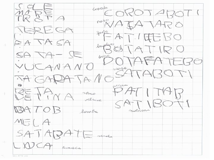 LIVELLO PRECONVENZIONALE vengono utilizzati fonemi a caso • Ciò che è scritto diventa un particolare disegno della realtà • È la fase della differenziazione • i significati delle parole corrispondono ad una diversa configurazione grafica • non c’è valore sonoro convenzionale.