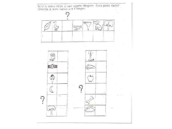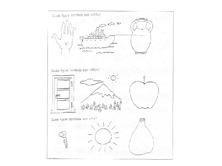 • Alla scuola primaria, per far acquisire la consapevolezza fonologica, si possono proporre attività come: - individuazione del fonema iniziale di parola; …. . - individuazione del fonema finale e poi intermedio; - analisi fonemica che è analoga al processo di scrittura; - fusione fonemica che è analoga al processo di lettura; - composizione di parole bisillabe; - associazioni grafema/fonema, associando lettere e immagini; - conteggio dei fonemi; - raggruppamento di immagini il cui nome comincia o finisce con lo stesso suono. • Si potrà iniziare dalle sillabe semplici (consonante-vocale) e scegliere innanzitutto le consonanti continue, utilizzando poi in abbinamento parole e immagini corrispondenti.