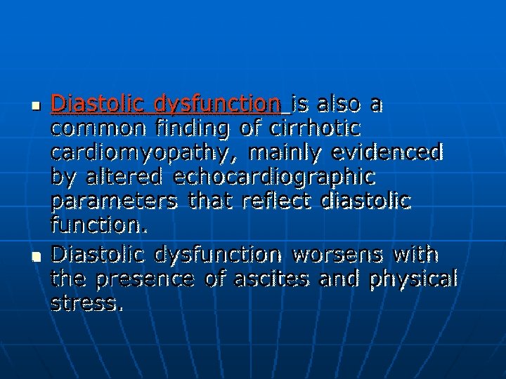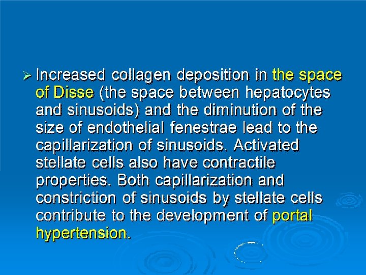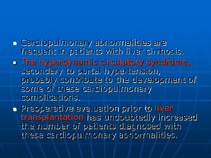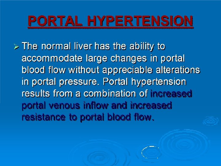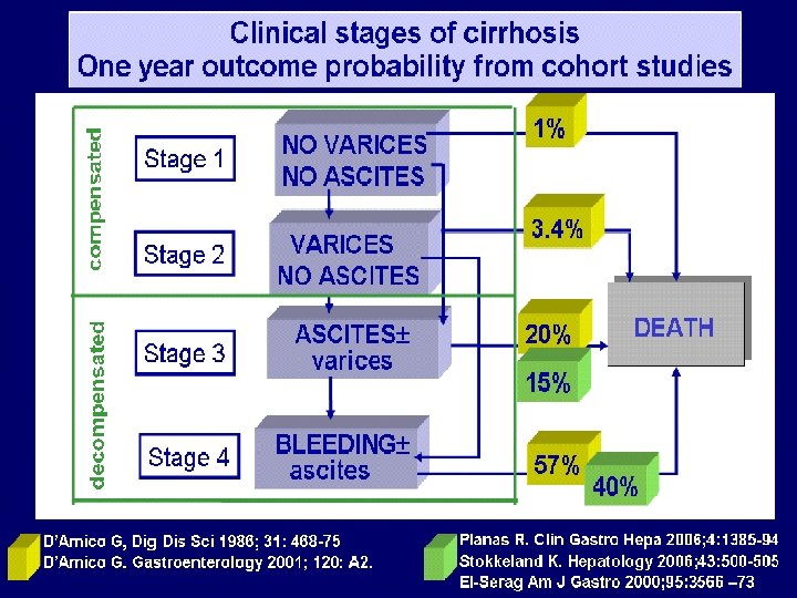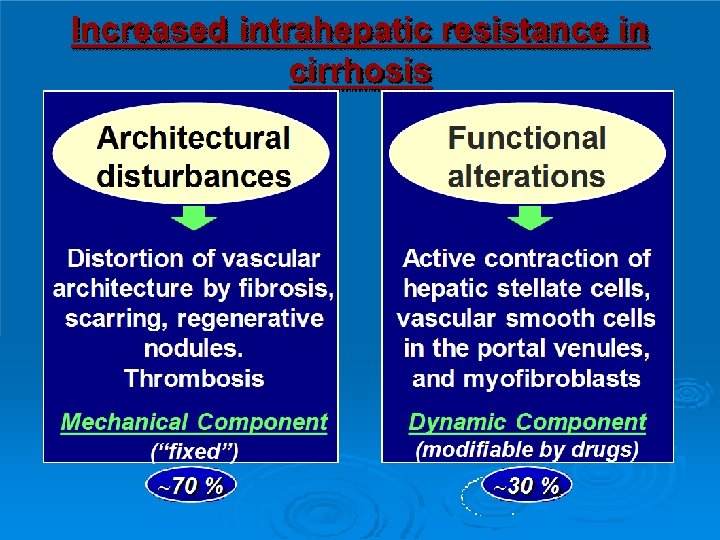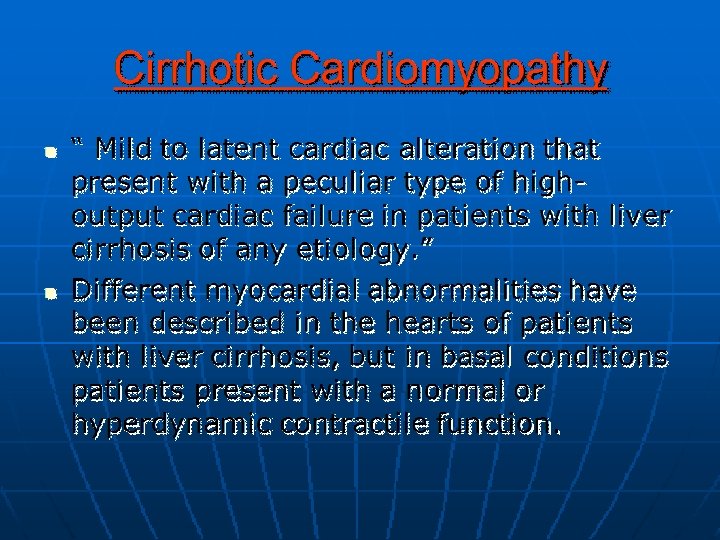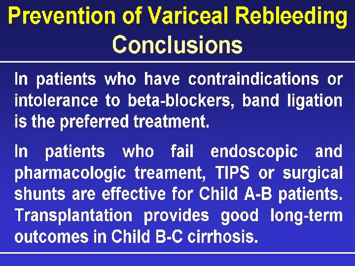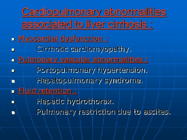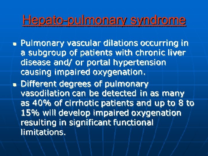Complications of Cirrhosis: �Gastro-esophageal variceal bleeding or bleeding from portal gastropathy. �Hepatic ( porto-systemic) encephalopathy. �Ascites, spontaneous bacterial peritonitis, and the hepatorenal syndrome. �Hepatocellular carcinoma. �Cardiopulmonary complications.