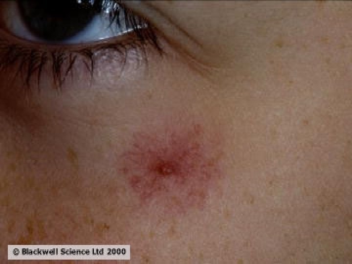 �The skin may be pigmented. �Purpura over the arms, shoulders, and lower limbs may be associated with a low platelets count. �Spontaneous bruising and epistaxis reflect a prothrombin deficiency. �The circulation is overactive. The blood pressure is low. �Sparse body hair, vascular spiders, palmar erythema, white nails and gonadal atrophy and gynecomastia are common.