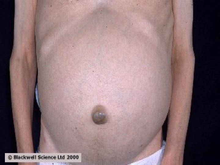 �Ascites is usually manifested by abdominal distension. �Edema of the legs is frequently associated. �The liver may be enlarged or shrunken, with a firm regular edge. �The spleen may be palpable.