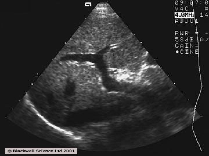 Abdominal ultrasound : �Mixed echopattern. �Dilated portal vein. �Enlarged spleen. �Ascites.