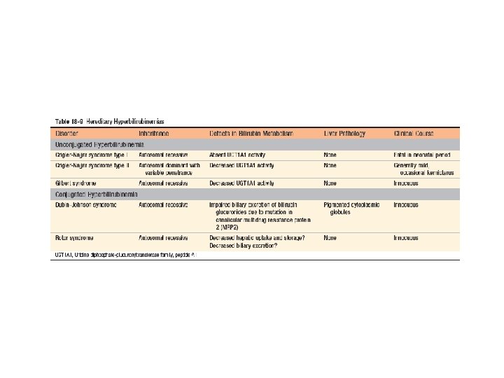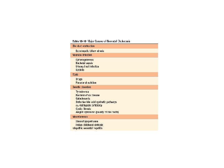 • Neonatal Cholestasis: Prolonged conjugated hyperbilirubinemia in the neonate (beyond 14 -21 days after birth). The major causes are: (1) cholangiopathies, primarily biliary atresia (complete or partial obstruction of the lumen of the extrahepatic biliary tree within the first 3 months of life). (2) A variety of disorders causing conjugated hyperbilirubinemia in the neonate, collectively referred to as neonatal hepatitis. Differentiation of biliary atresia from nonobstructive neonatal cholestasis is very important, since definitive treatment of biliary atresia requires surgical intervention (Kasai procedure), whereas surgery may adversely affect the clinical course of a child with other disorders. Affected infants have jaundice, dark urine, light or acholic stools, and hepatomegaly