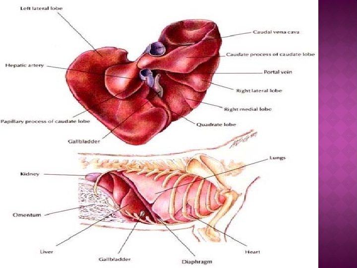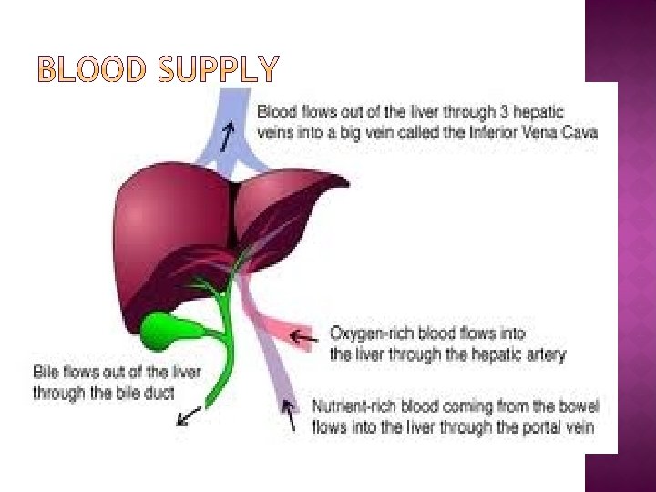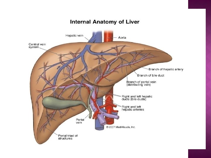 The externally visible falciform ligament divides the left lobe into the medial and lateral segments. � Liver is supplied with blood from two sources –the hepatic artery & portal vein. � Responsible for 25 %of the basal metabolism & intimately concerned with the metabolism of fats, protiens & CHO. �