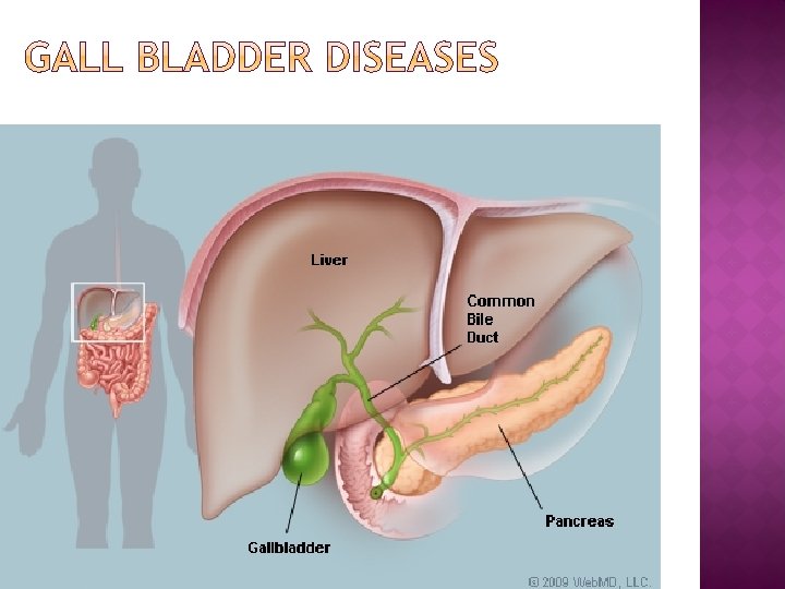 � The formation of gallstones (calculi) in the absence of infection of the gallbladder is called cholelithiasis. � all gallstones form within the gallbladder � Gallstones that pass from the gallbladder into the common bile duct may remain there indefinitely without causing symptoms, or they may pass into the duodenum with or without symptoms. � Choledocholithiasis develops when stones slip into the bile ducts, producing obstruction, pain, and cramps. � If passage of bile into the duodenum is interrupted, cholecystitis can develop. In the absence of bile in the intestine, lipid absorption is impaired, and without bile pigments, stools become light in color. � If uncorrected, bile backup can result in jaundice and liver damage (secondary biliary cirrhosis). � Obstruction of the distal common bile duct can lead to pancreatitis if the pancreatic duct is blocked.