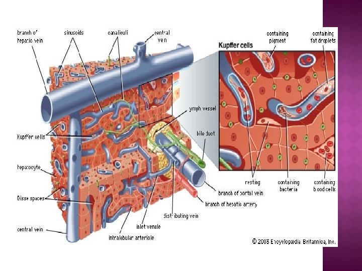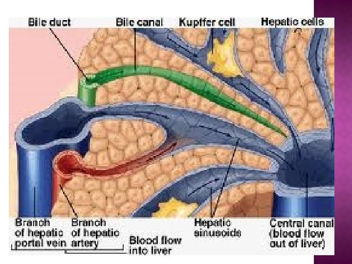 � Composed of 50, 000100, 000 lobules. � Each lobule consist of a central vein surrounded by tiny liver cells grouped in the sheet or bundle. � Small branch of hepatic vein extends through their centre. . � Space b/w these cells contain sinusoids (blood vessels that are irregular in shape, incomplete in size &wider than blood capillaries. )