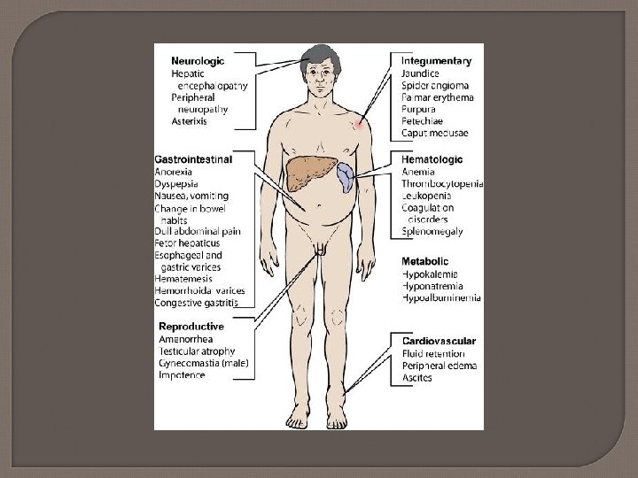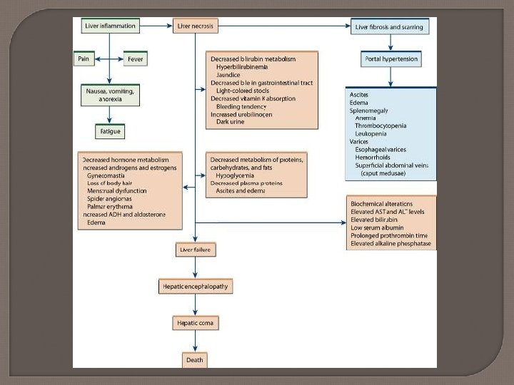 Liver Failure Causes Alcohol abuse Hepatotoxic drugs (p. 1070) Hepatitis Biliary disease Non-alcoholic fatty liver disease S/S: Hepatomegaly, ascites, anorexia, nausea, jaundice/itching, fatigue, weight loss, bruising, varices, peripheral edema, elevated liver functions (p. 1073 -1074)