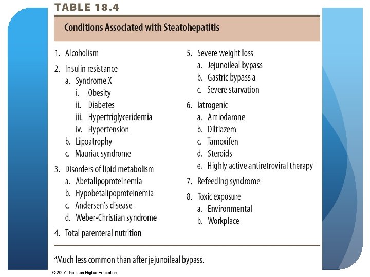 Pathophysiology of the Liver Fatty Liver – Etiology Liver increases in size and weight by 5% making it not possible to see lab values Steatohepatitis – inflammation in that area, related to ALD If alcohol not present – NASH NAFLD progresses to cirrhosis and hepatic carcinoma Strong association with obesity, diabetes, metabolic syndrome Most common type among adolescents