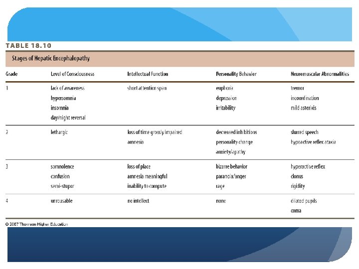 Pathophysiology of the Liver Cirrhosis – hepatic encephalopathy (end stages associated with liver failure) Syndrome of impaired mental status and abnormal neuromuscular function 2 types graded onto 4 clinical scales; Child-Pugh score The Glasgow coma scale: look at functions 3 -15, 3 worst “Flap” - asterixis