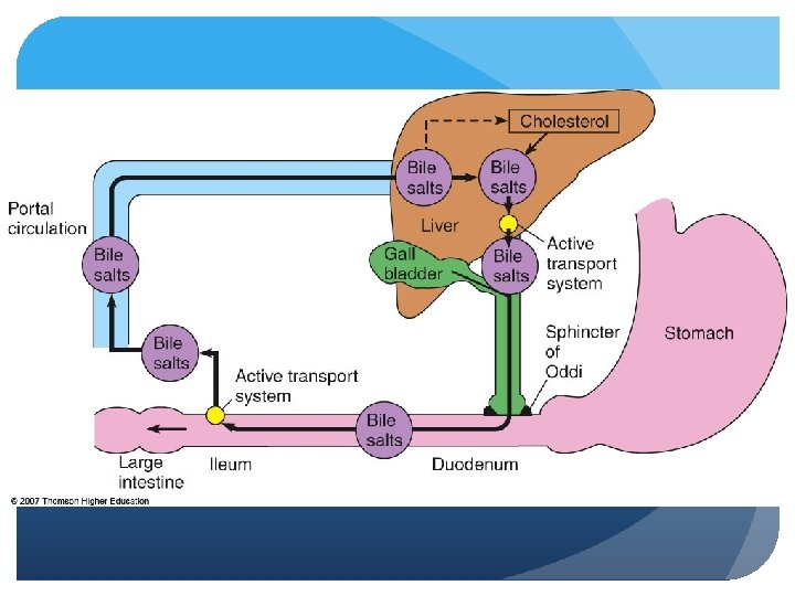 The Gallbladder Stores, concentrates and secretes bile Removal of water and electrolytes – increasing concentration Storage Control of delivery of bile salts to duodenum Main functions: excreting it in presence of food to help digest fat Complications: gallstones- will but on low-fat diet to relieve pressure