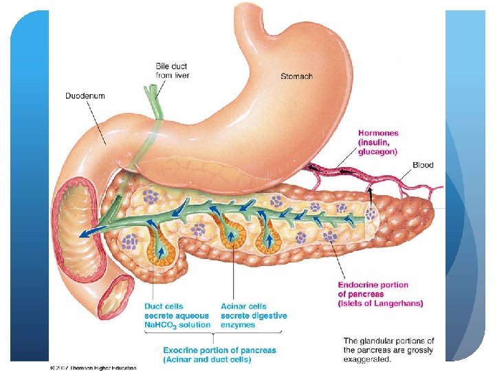 The Pancreas Pancreatitis - Insufficiency Frequent, small meals moderate to low in fat Pancreatic enzymes taken with food (treat steatorrhea- decreased absorption of fat) Alcohol, coffee, tea, spices, irritant condiments avoided MCT may be added Maintain weight Monitor fat and water-soluble vitamins Medical management of p. H Treat with insulin if indicated