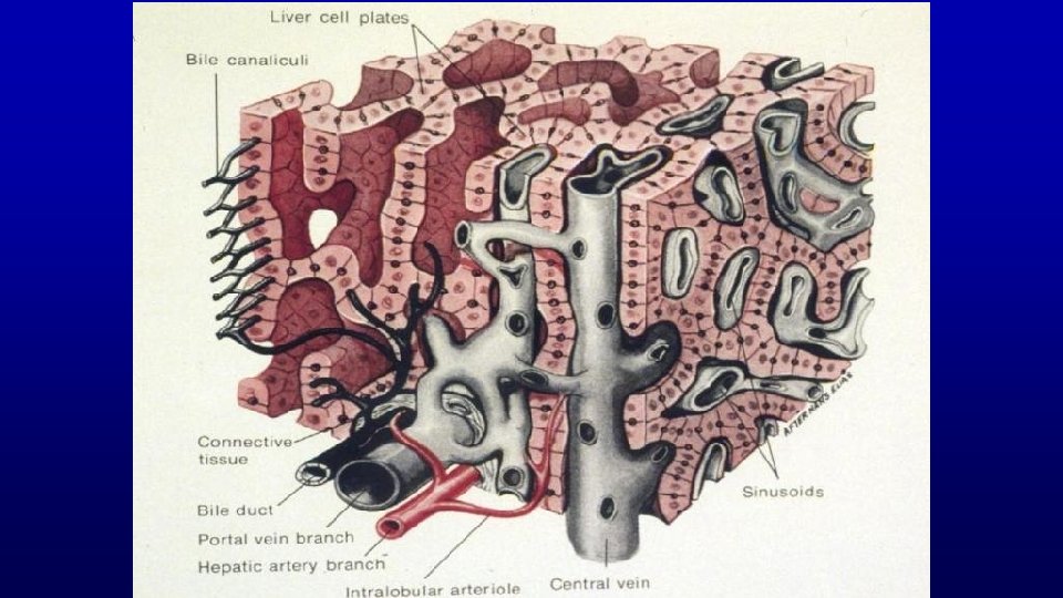 454 Liver Central vein Cords of hepatocytes Portal radicles containing: A bile duct Branch of hepatic artery Branch of portal vein Lymphatic vessel (usually)