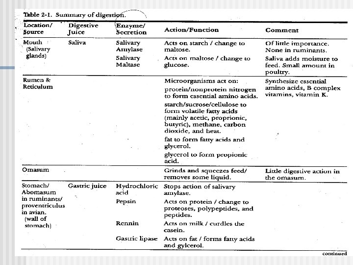 Summary n n n Digestion is breaking feed down into simple substances that can be absorbed by the body. Digestion occurs when feeds are broken up mechanically and acted upon by enzymes and other digestive juices. Most absorption of nutrients after digestion takes place in the small intestine, although some absorption occurs in the rumen.