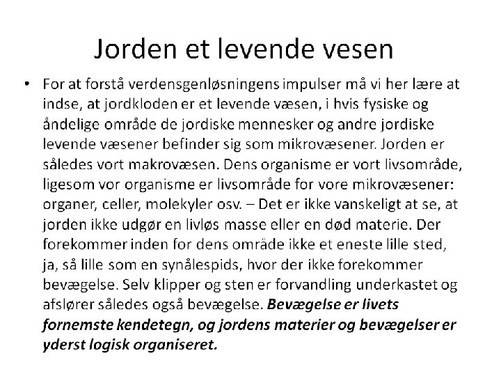 Jordklodens religiøse krise • Jordklodevesenet er for tiden inne i en veldig religiøs opplevelse. Den er i ferd med å oppleve «den store fødsel» , og forut for denne opplevelse går der en religiøs krise, som legger et enormt press på dens organisme. Dette press er det som menneskeheten opplever som krig og lemlestelse. Denne tilstand virker så stor og uoverskuelig for oss, fordi vi er mikrovesener i jordklodens organisme. • Jordklodevesenet gjennomrystes av feber og må derfor etter hvert mobilisere all sin følelsesenergi for å binde den oppblussende tyngdeenergi, som gir feber. Kosmos 2013/9