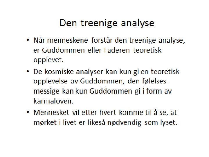 Mennesket som forsyn • Som selve den samlende og styrende faktor i vår egen organisme må vi karakteriseres som en slags forsyn for alle de levende vesener, som befinner seg i det univers, som organismen utgjør. • Hver eneste mikropartikkel i vår organisme er plassert i et livsrom, som er underkastet vår kontroll, og vi kan ikke unndra oss denne kontroll, uten at det går ut over organismen som redskap for vår manifestasjon. • Det betyr noe at man får den rette føde , den tilstrekkelige hvile og avslapping, den nødvendige mosjon, og hva der ellers er gavnlig for selve den fysiske kropp. • Men det betyr minst likeså mye, at man er i stand til å overvinne de tanker og følelser, som kan virke direkte destruktivt, ikke alene i nervesystemet, men gjennom nervesystemet også i vidt forskjellige områder eller livsrom i organismen.