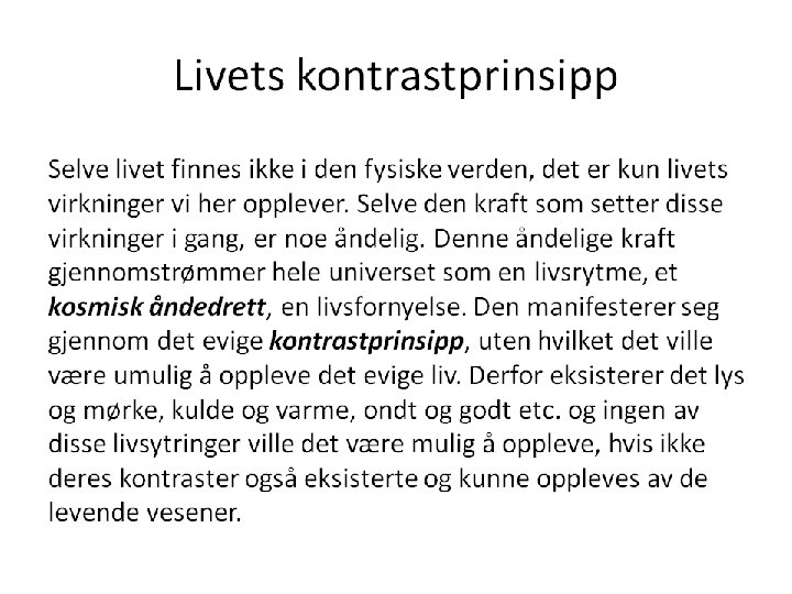 Mennesket som forsyn • Som selve den samlende og styrende faktor i vår egen organisme må vi karakteriseres som en slags forsyn for alle de levende vesener, som befinner seg i det univers, som organismen utgjør. • Hver eneste mikropartikkel i vår organisme er plassert i et livsrom, som er underkastet vår kontroll, og vi kan ikke unndra oss denne kontroll, uten at det går ut over organismen som redskap for vår manifestasjon. • Det betyr noe at man får den rette føde , den tilstrekkelige hvile og avslapping, den nødvendige mosjon, og hva der ellers er gavnlig for selve den fysiske kropp. • Men det betyr minst likeså mye, at man er i stand til å overvinne de tanker og følelser, som kan virke direkte destruktivt, ikke alene i nervesystemet, men gjennom nervesystemet også i vidt forskjellige områder eller livsrom i organismen.