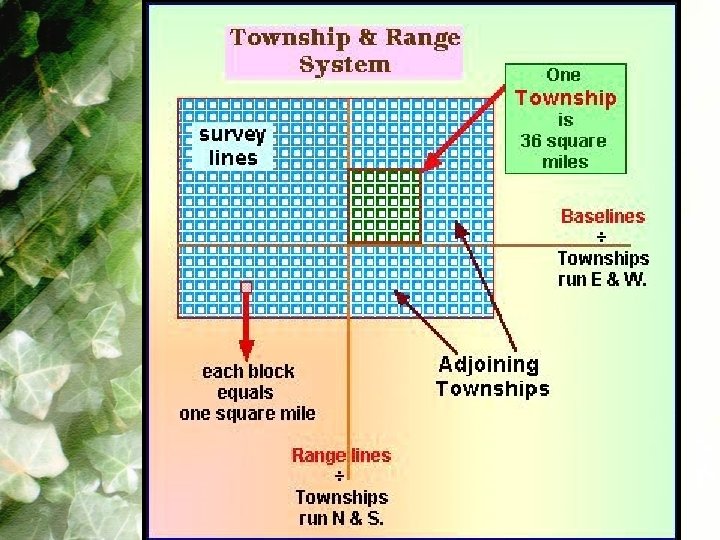 Plotting the West • Property lines and Boundaries were split by doing the following – • First, the land was surveyed and broken into townships, sections consisting of 640 acres, and each section was divided into quarters. • Corners would be marked by settlers (Homesteaders) or by marking a “Witness Tree” • A witness tree was the nearest tree to a corner.
