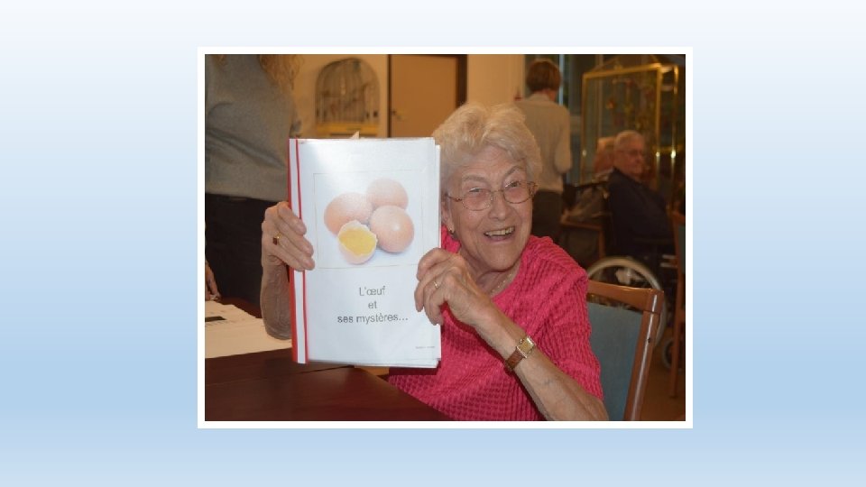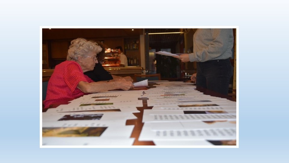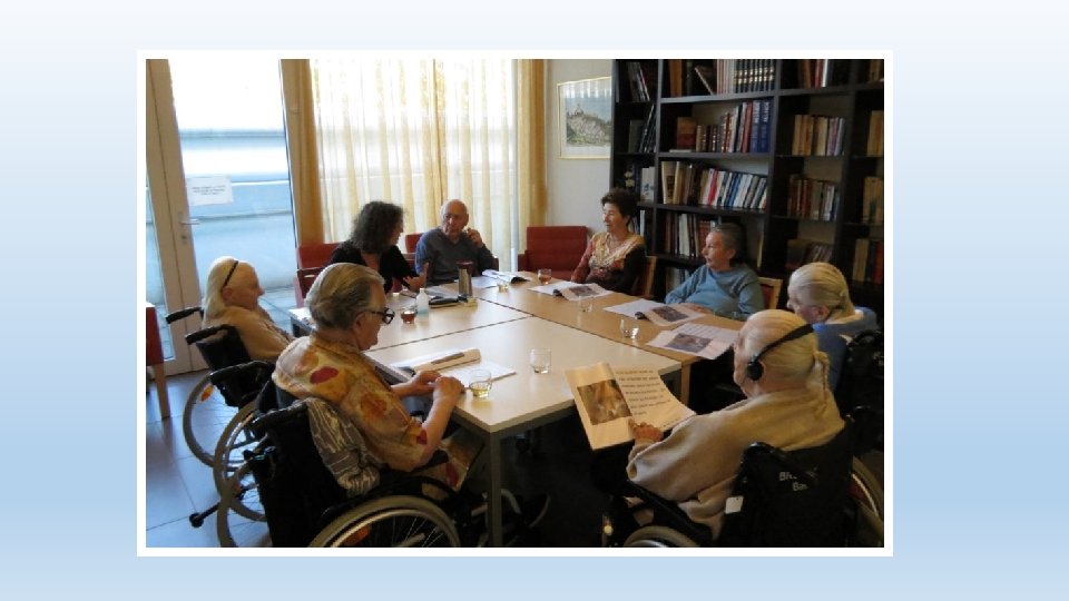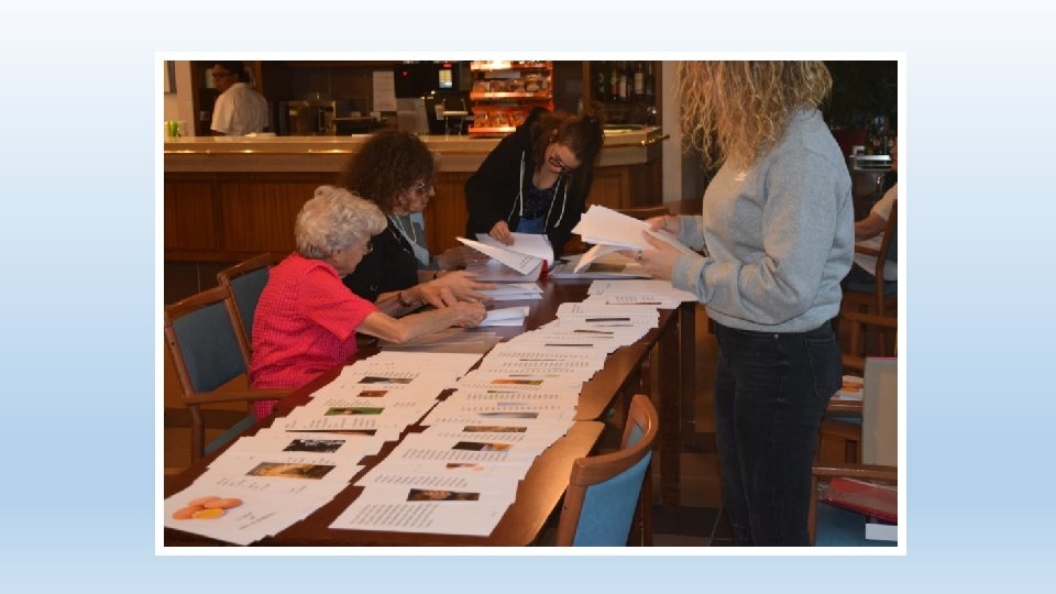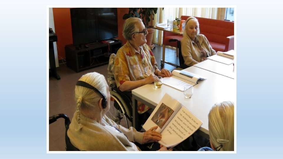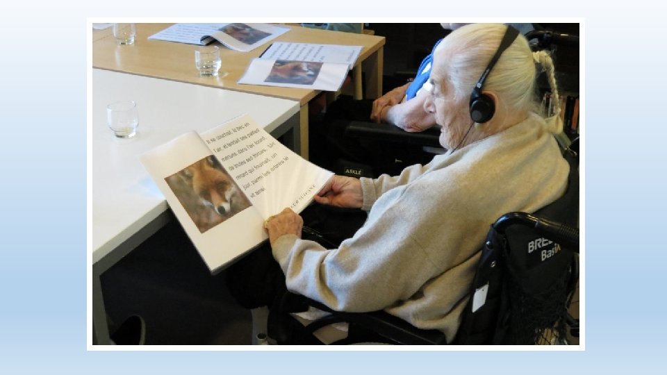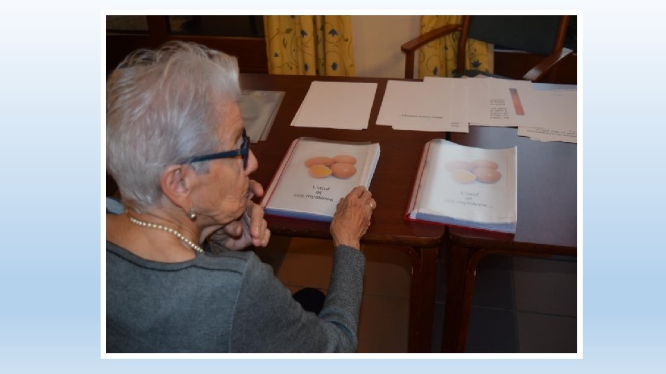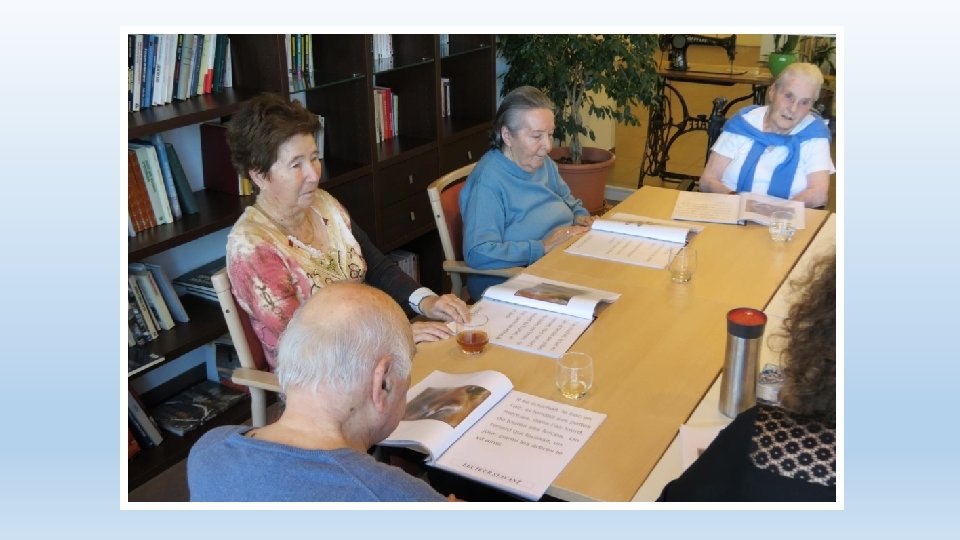 Phase de «mise sous pli» • Création manuelle des livres écrits (textes imprimés, fourres en plastique, porte document) • Activités effectuées en collaboration avec les résidents • Aussi bien avec ou sans troubles cognitifs • Dans un lieu de passage • Une animation en soi • Attise la curiosité du personnel interdisciplinaire, des visites • Attention de préparer en amont le travail à soumettre aux résidents