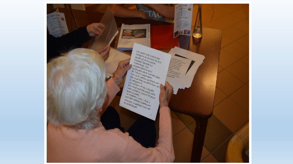 Mise en place d’atelier lecture • Constituer un petit groupe de personnes désorientées • Se trouver dans un lieu fermé ou chacun puisse bien entendre • Lire et suivre les instructions (lecteur suivant) • Chaque participant lit à son tour le texte (animateur y compris)