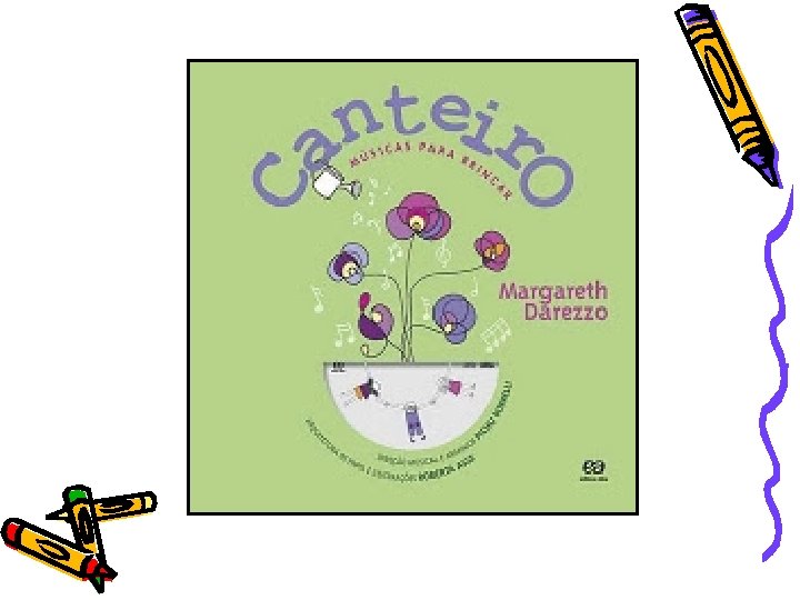 Canteiro – Musicas para Brincar • Autora: Margareth Darezzo • Editora Ática • Livro com CD com músicas de diversos temas. No livro há as letras das músicas e algumas atividades relacionadas ao tema. Introduz conceitos básicos a respeito dos instrumentos e sons • R$ 29, 90 ( Livrarias Curitiba)